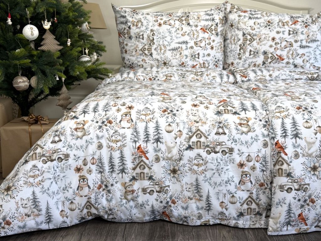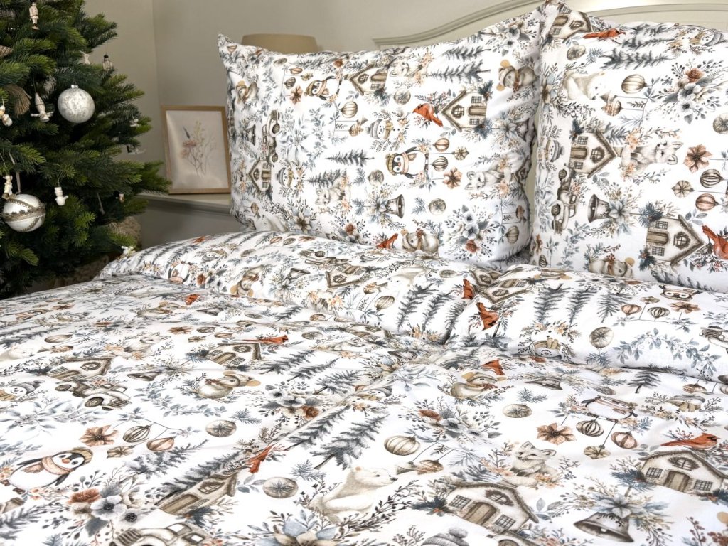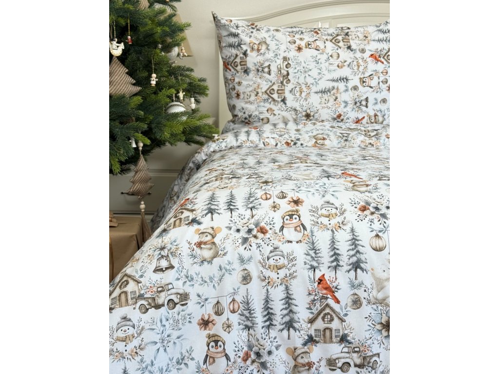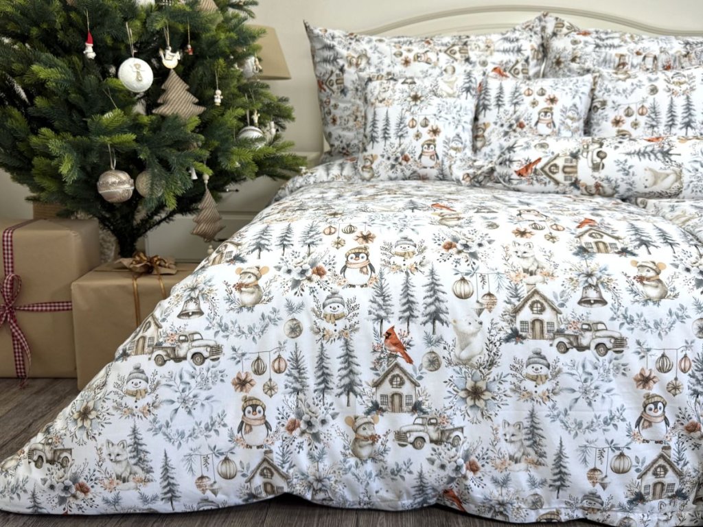 Zahalte svou ložnici do kouzelné zimní atmosféry s tímto nádherným bavlněným povlečením s vánočním zimním vzorem. Na sněhově bílém podkladu se rozprostírá klidná zimní krajina s zasněženými stromy, větvičkami, roztomilou myškou s čepicí, tučňákem, chaloupkami, ptáčky a vánočními ozdobami. Jemné šedobéžové tóny dodávají povlečení elegantní vzhled, který zapadne do každého interiéru a navodí příjemnou sváteční atmosféru.