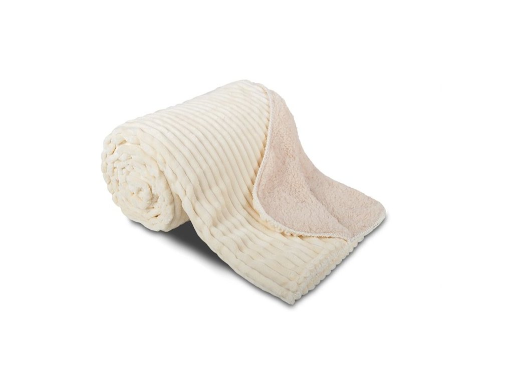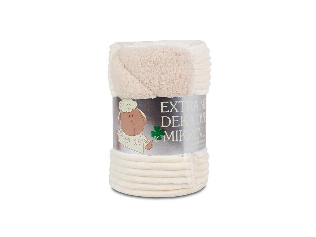 Krémová dvouvrstvá deka z mikroflanelu Vnější strana deky se skládá z manžestrové úpravy a vnitřní stranu tvoří huňatá neškrabavá imitace ovčí vlny s názvem Ovečka®. Lze prát v pračce na 30 stupňů bez obav z tzv. žmolkování.