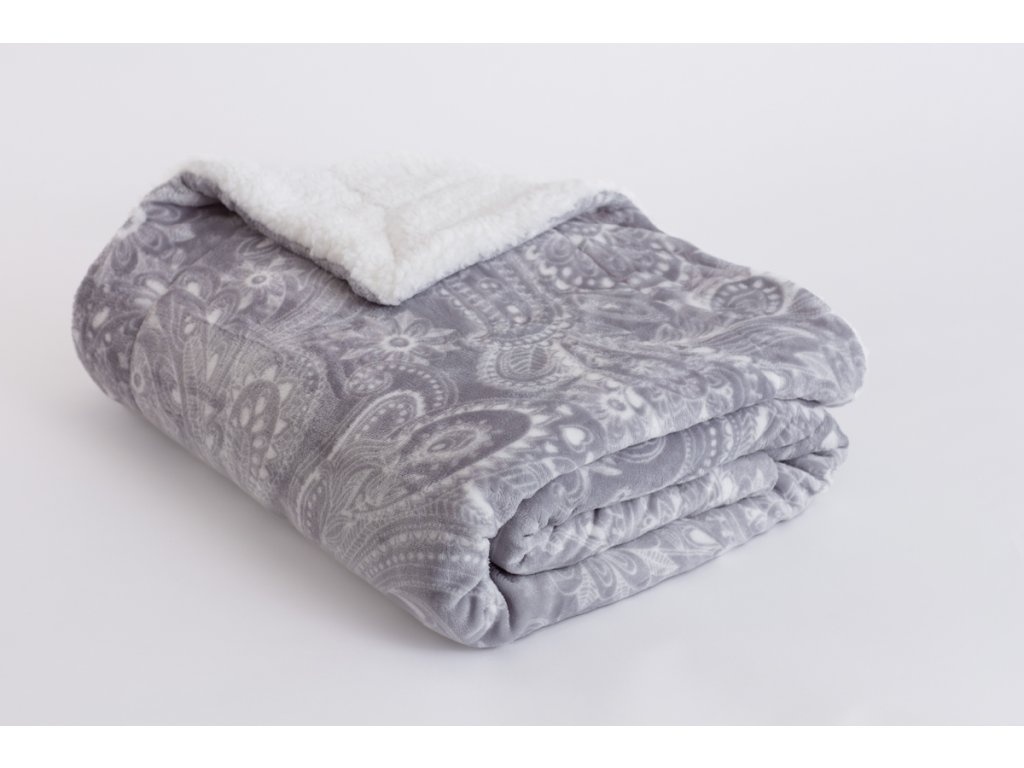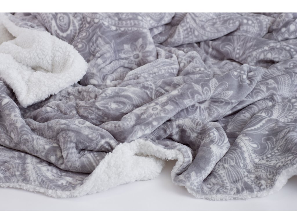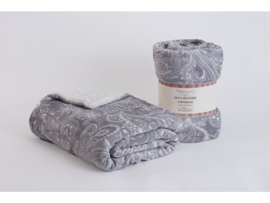 Hřejivá šedá deka z mikroflanelu s oboustranným designem – z jedné strany nadčasový potisk, z druhé měkký bílý beránek. Ideální na zimní večery, do ložnice i na gauč. Hebká, lehká a extra teplá. Skvělý doplněk pro stylový i útulný domov.