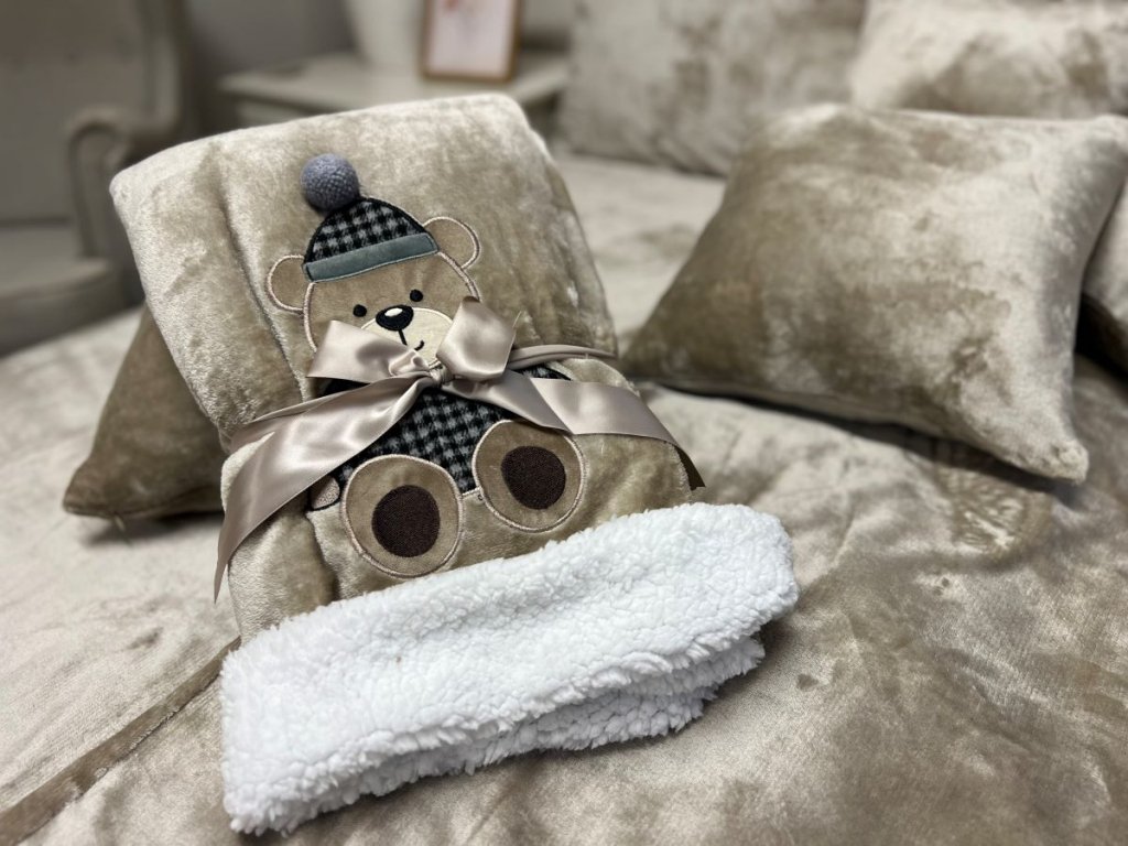 Luxusní dětská deka s roztomilou výšivkou medvídka spojuje stylový vzhled, mimořádnou hebkost a hřejivé pohodlí. Z jedné strany jemný mikroflanel v béžové barvě, z druhé strany bílý beránek, který zahřeje i v chladných dnech. Ideální deka pro odpočinek, jako přikrývka do postýlky, na gauč nebo jako dekorace do dětského pokoje.
