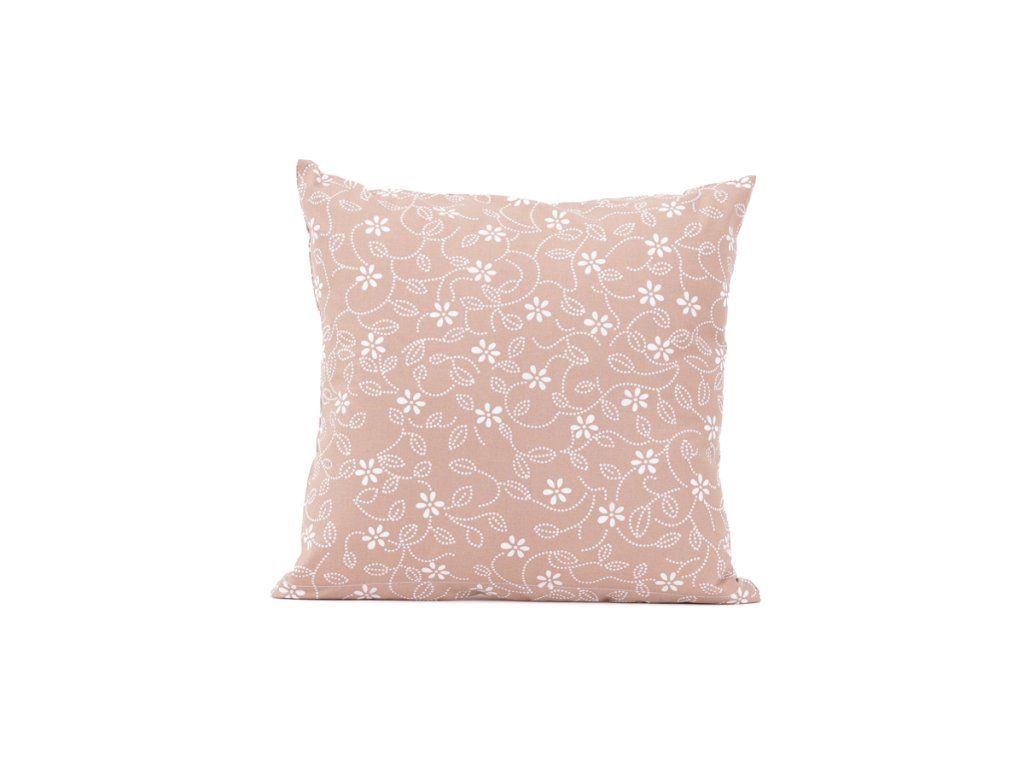 Elegantní béžový povlak na polštář s jemným květinovým vzorem v bílé barvě.