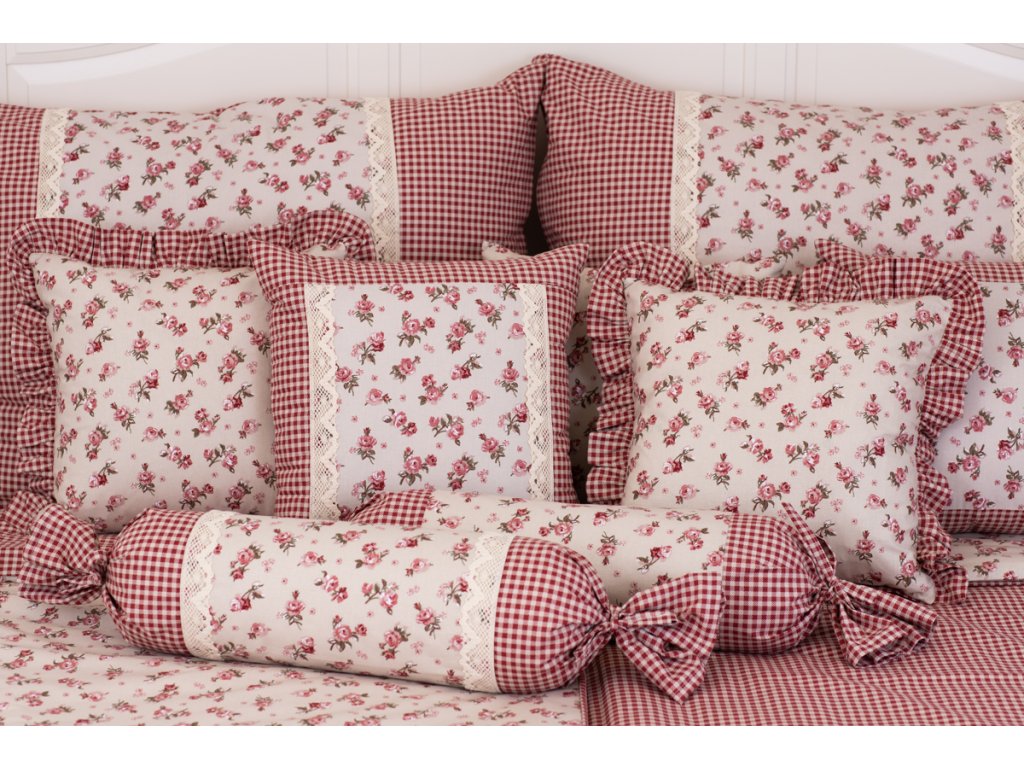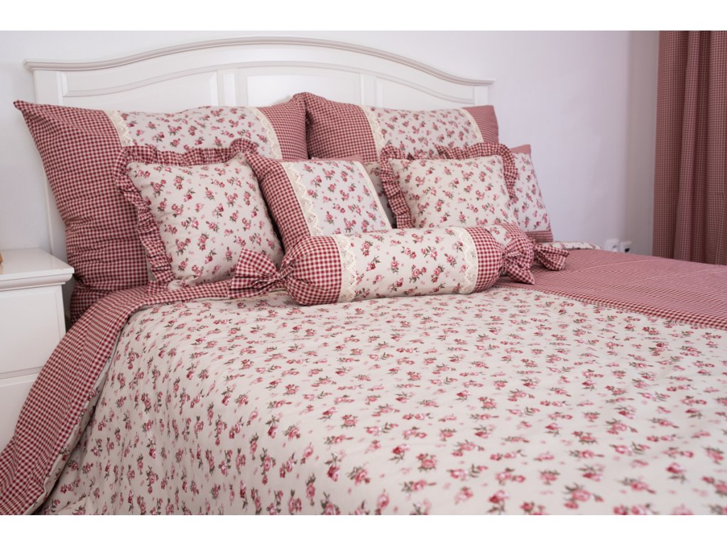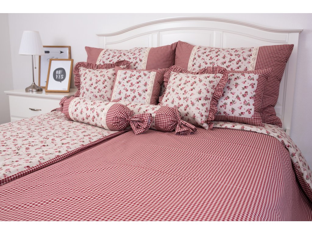 Kvalitní oboustranné povlečení s růžičkami a kostičkou v bordó a béžové barvě. Velký polštář je navíc ozdoben bavlněnou krajkou.