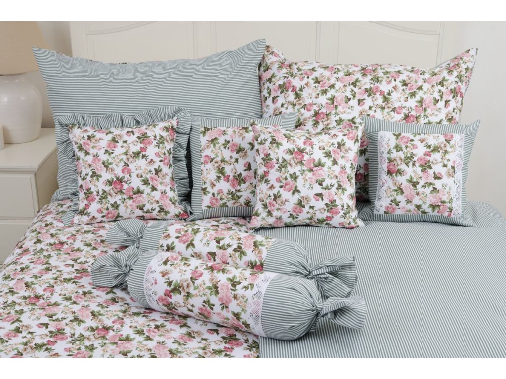 Krepové povlečení RŮŽE RUSTIKÁL / olivový proužek