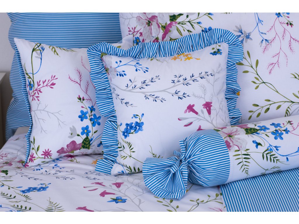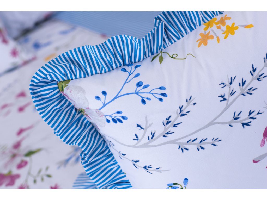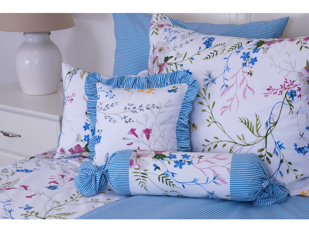 Oboustranný bavlněný polštář s motivem luční kvítí a modrým proužkem – něžný venkovský styl