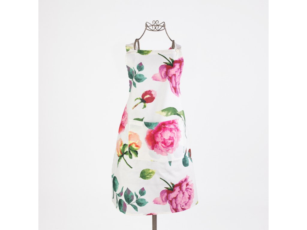 Praktická bavlněná zástěra s pivoňkami. Do sady si můžete přikoupit chňapku, ubrus, podsedák na židli nebo metráž ve stejném designu.